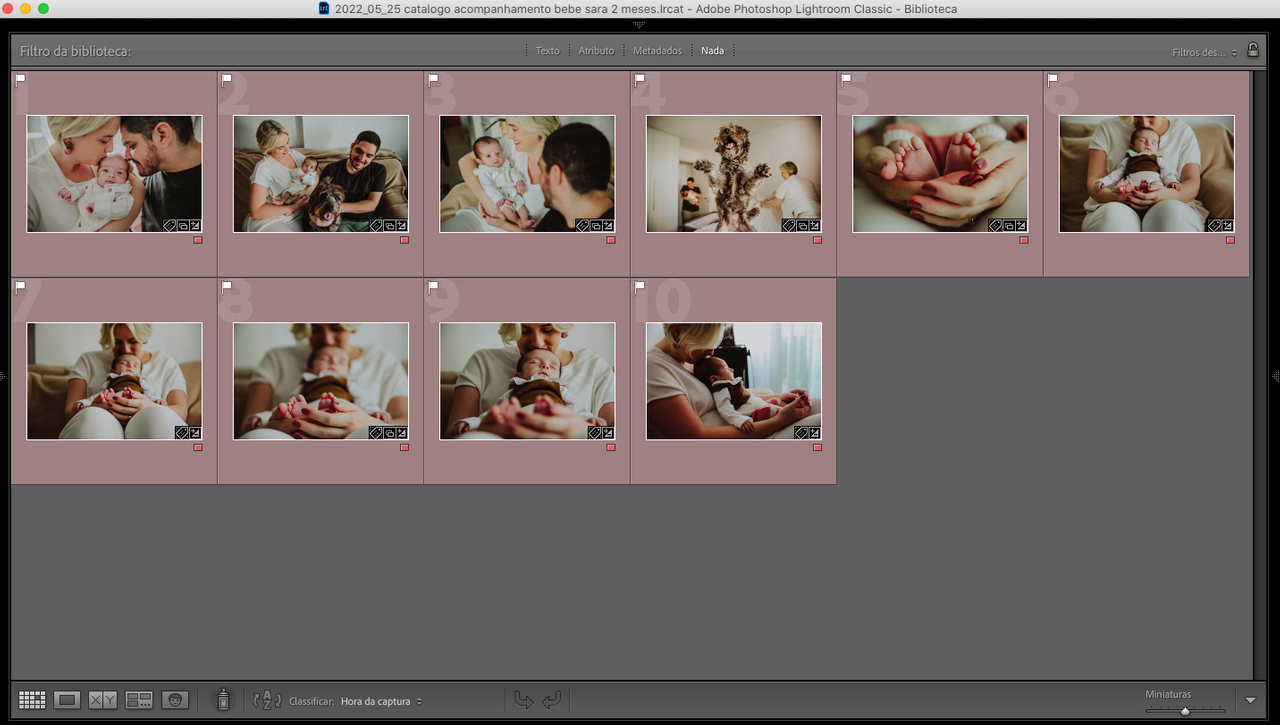 Antes de enviar as fotografias para exportação, é importante fazer um processo que eu chamo de prova da consistência onde você vai abrir seu catálogo do Lightroom no modo Biblioteca, excluir as barras laterais para melhor visualização e então observar as miniaturas de uma forma global.
